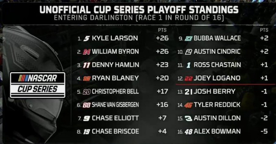 Four of the 16 playoff drivers will be eliminated after three races. After three rounds, the four remaining drivers will compete in a winner-take-all race for the championship at Phoenix Raceway on Nov. 2.