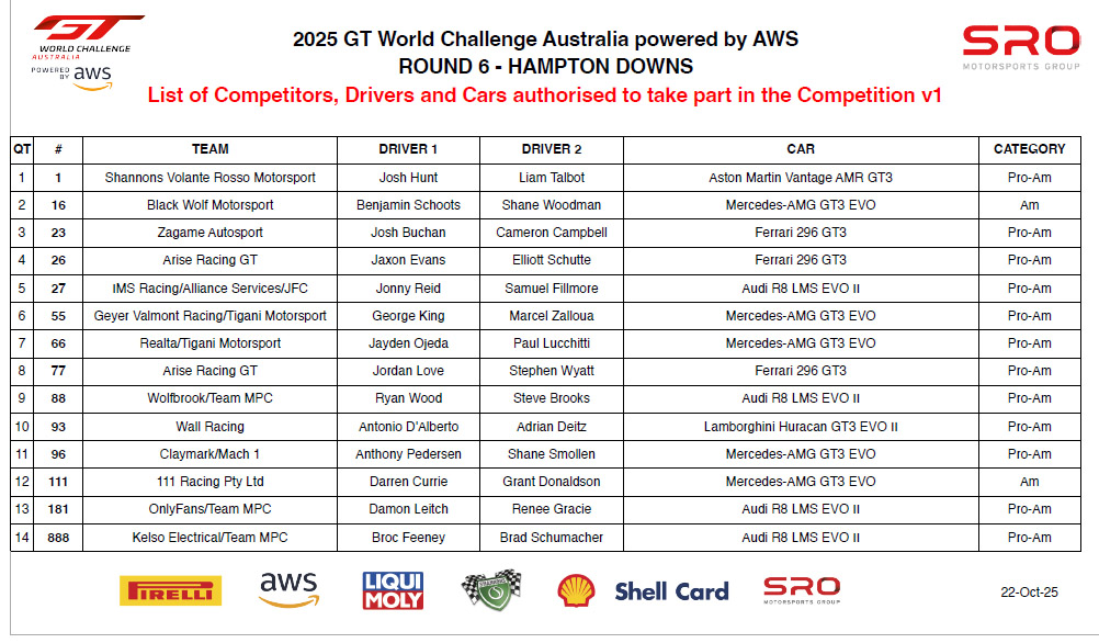 The entry list for the final round of the 2025 GT World Challenge Australia season features a strong 14-car field, set to do battle on unfamiliar territory at New Zealand’s GT Festival Hampton Downs.